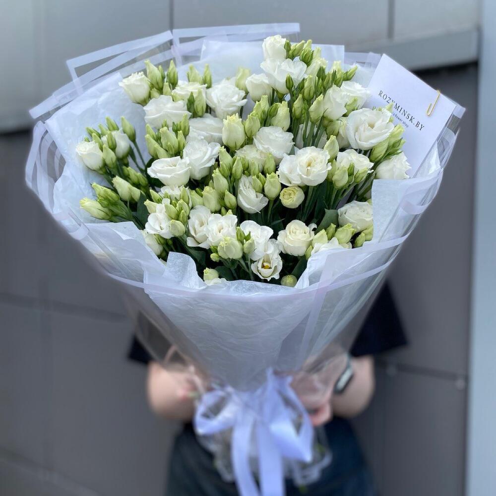 Тишью - 1 шт. Атласная лента - 1 шт. Оформление - 1 шт. эустома белая - 11 шт.